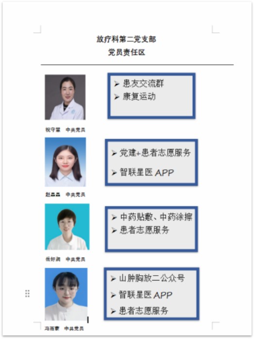 支部委员牵头,推动“互联网+健康教育”作为科室党建重点任务,构建“立体化科普矩阵”;建立“山肿瘤放二”“山肿瘤放Healing Rays”公众号,发布原创科普60余篇;运营400人患友交流群,累计答疑解惑40余次,开发“智联星医APP”,制作健康运动短视频惠及超1000人次;联动42城开展“益彩明天”公益讲座。