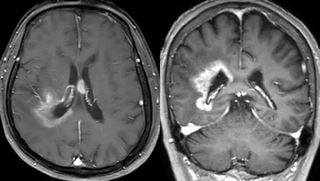 近日,一名80岁老年患者因“头晕伴左下肢感觉减退”就诊于我院神经外科,颅脑增强MR检查提示:右侧脑室后角旁及三角区占位,提示中枢神经系统淋巴瘤或胶质瘤可能。由于诊断不明确,难以提供确切、精准的后续治疗方案。患者高龄,病变位于功能区,多发散在,位置深,直接手术切除创伤大,易导致功能障碍。经术前多学科会诊,决定通过神经外科导航手术机器人辅助下微创活检,明确病理性质,为下一步治疗明确方向。