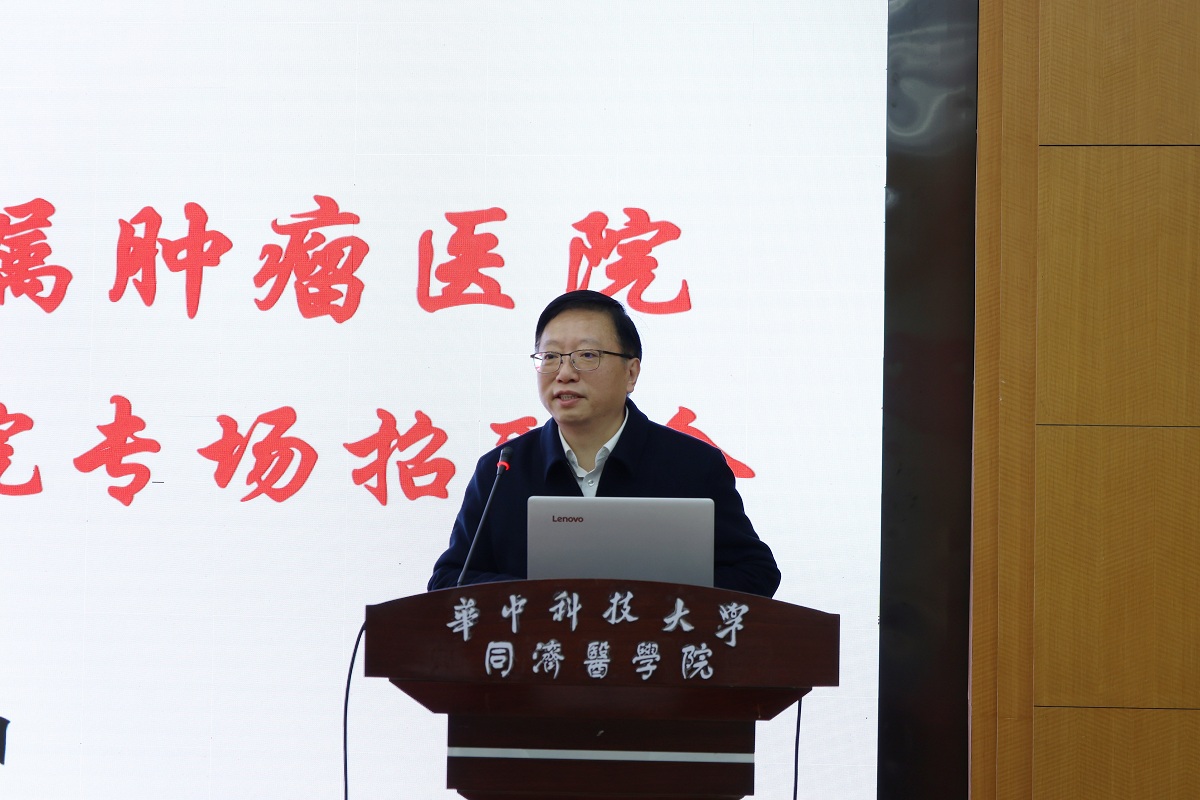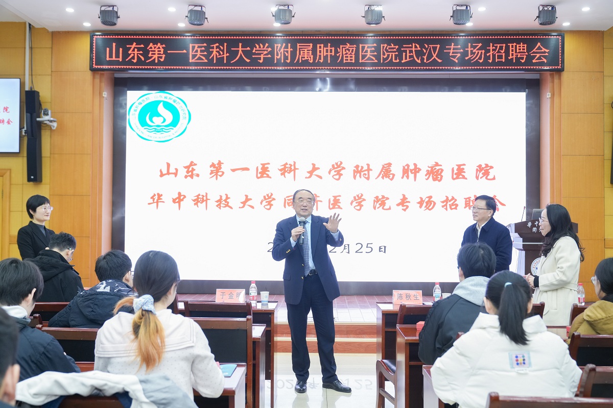 为深入实施人才强院战略,广泛吸引顶尖医学人才,12月25日,我院2026年“院士领衔,广纳贤才”校园招聘行来到了华中科技大学同济医学院,中国工程院院士、我院院长于金明,中国工程院院士、华中科技大学同济医学院院长邬堂春,华中科技大学同济医学院党委副书记陈秋生,我院副院长邢力刚,华中科技大学医学学生工作处副处长冯霞出席活动,山东省肿瘤医院和华中科技大学同济医学院相关部门负责人参加活动,陈秋生副书记主持活动。