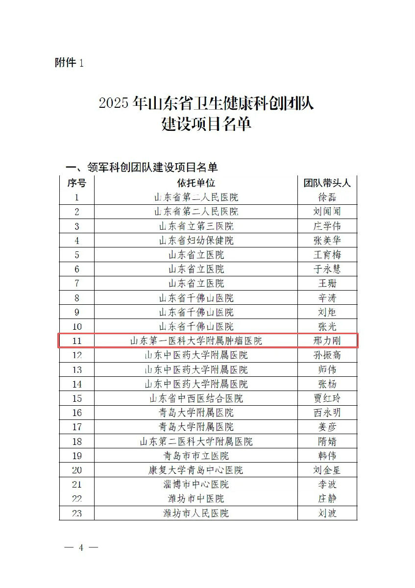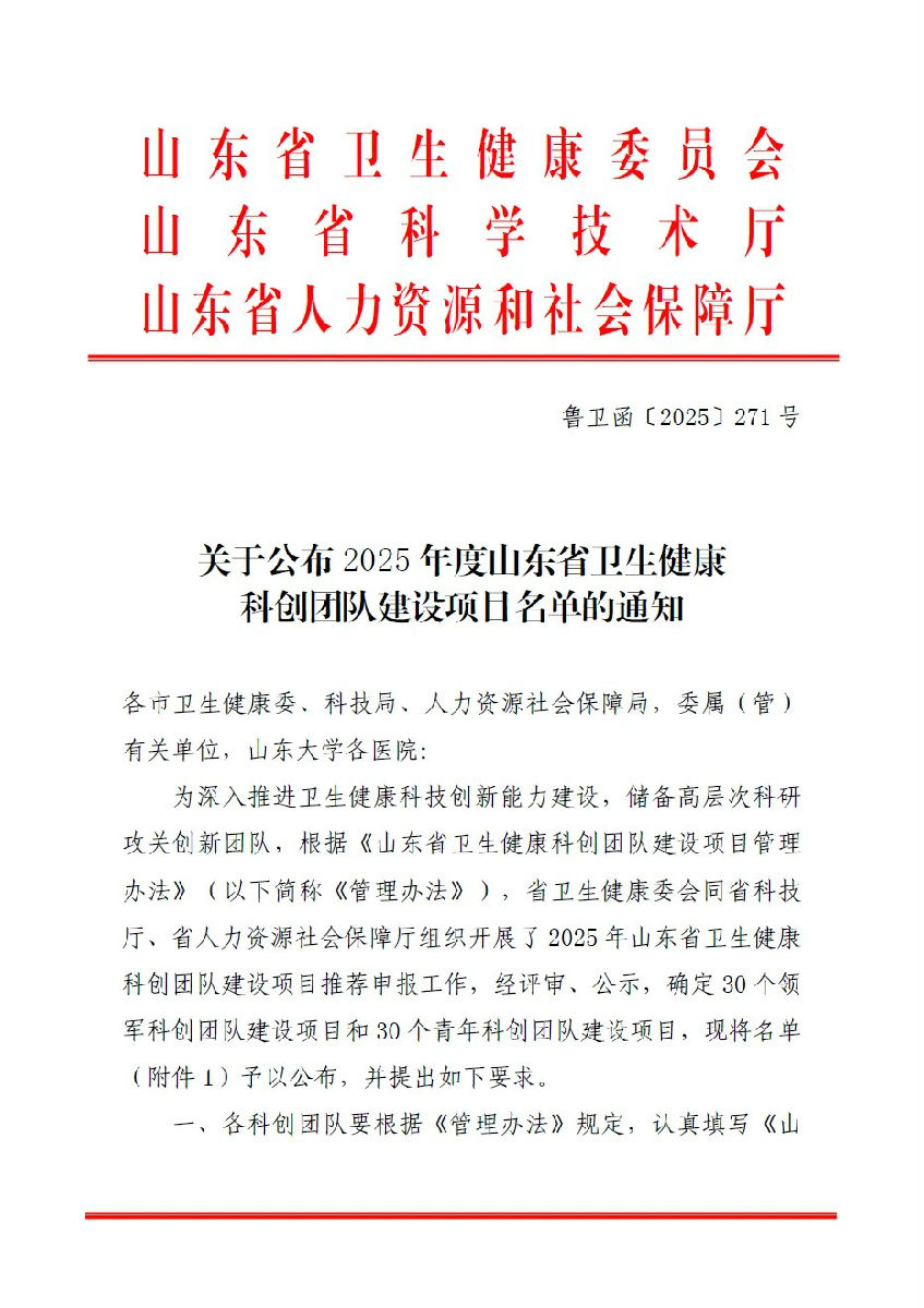 近日,山东省卫生健康委员会、山东省科学技术厅、山东省人力资源和社会保障厅联合印发《关于公布2025年度山东省卫生健康科创团队建设项目名单的通知》,我院邢力刚教授领衔的“新型核药肿瘤精准诊疗团队”成功入选山东省卫生健康科创团队领军科创团队建设项目。