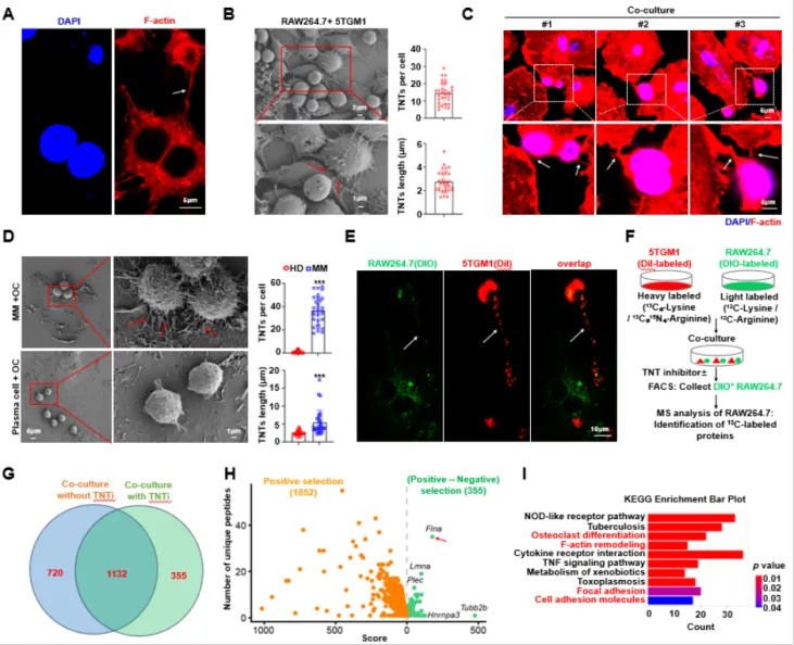 研究团队建立了骨髓瘤细胞与破骨细胞前体的直接共培养体系,发现两类细胞之间存在大量TNT结构。通过稳定同位素标记(SILAC)结合正负双重筛选策略,研究人员鉴定出Filamin A(FLNA)为TNT介导转运的重要效应分子。进一步研究表明,骨髓瘤细胞可通过TNT将FLNA定向转运至破骨细胞前体,进而促进破骨分化并维持细胞骨架及足小体结构稳定。