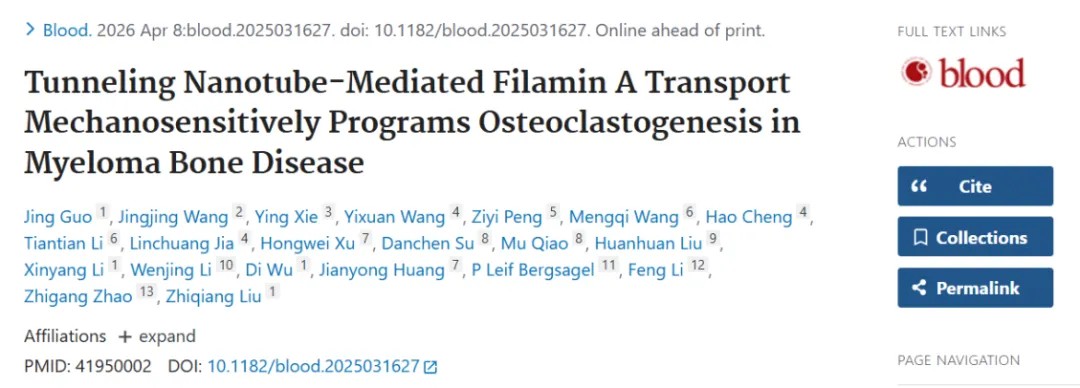 近日,我院质子中心实验室刘志强教授研究团队在血液学领域国际权威期刊Blood(IF=23.1)发表了题为《Tunneling Nanotube-Mediated Intercellular Transport of Filamin AMechanosensitively Programs Osteoclastogenesis in Myeloma Bone Disease》的研究论文。该研究发现,骨髓瘤细胞可通过隧道纳米管(tunnelingnanotubes,TNTs)与破骨细胞前体建立直接连接,并定向转运细胞骨架关键蛋白FilaminA重塑破骨细胞的骨架结构与力学特性,促进破骨分化及骨破坏。该成果从细胞力学生物学角度阐明了骨髓瘤骨病发生发展的重要机制,为相关靶向干预策略的研发提供了新的理论依据。