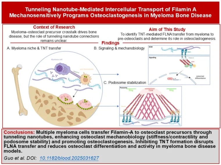 该研究从细胞间物质转运这一全新视角,揭示了骨髓瘤细胞通过TNT向破骨细胞前体递送FLNA,并通过调控细胞骨架及足小体相关网络促进破骨分化和骨破坏的机制。研究结果进一步丰富了对骨髓瘤骨病发病机制的认识,并为探索相关靶向干预策略提供了新的理论依据。