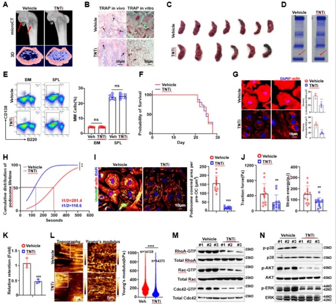 在体内,研究团队利用Vk*MYC和5TGM1等骨髓瘤小鼠模型进一步验证了上述机制的病理意义。结果显示,TNT抑制剂可显著阻断FLNA向破骨细胞转运,减轻骨质破坏并抑制破骨活性,而对肿瘤负荷无明显影响。该研究提示,靶向TNT介导的细胞间物质转运,有望通过抑制病理性破骨过程改善骨髓瘤骨病,为相关治疗策略提供了新的思路。