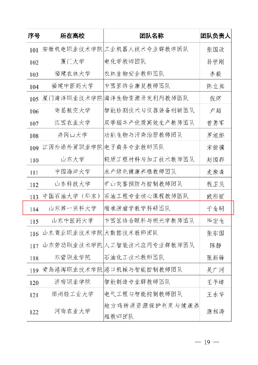 成立山一大肿瘤临床学院,正式承担本科教学;于金明院士领衔的“精准肿瘤学教学科研团队”成功入选“全国高校黄大年式教师团队”,实现山东第一医科大学零的突破;于金明院士获评山东省高等学校教学名师,其牵头的项目获山东省教学成果特等奖。