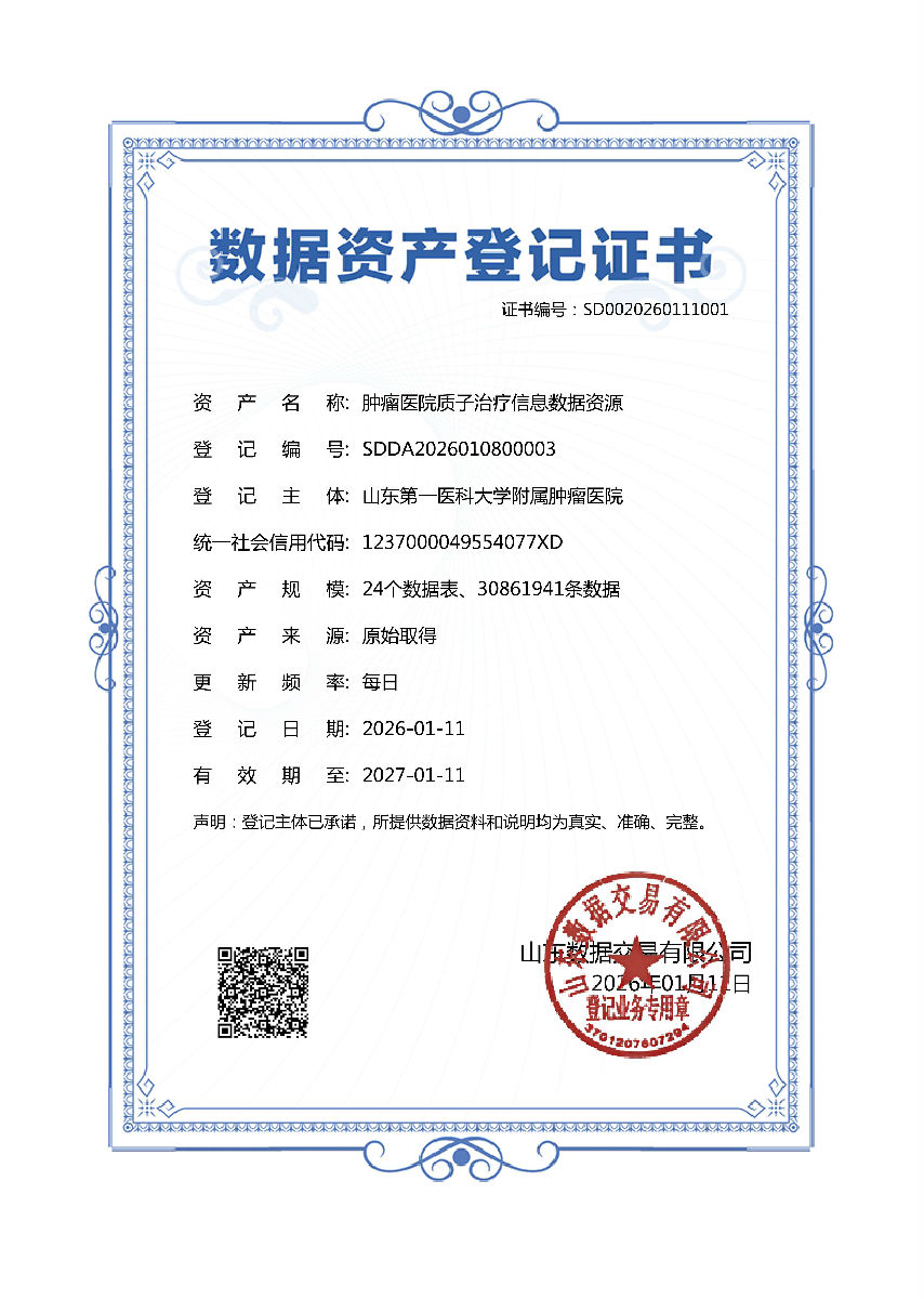 本次登记的“质子治疗精准放疗数据集”系统整合了质子治疗全流程中的多模态信息,涵盖患者全流程业务管理关键维度。在严格遵循数据安全与隐私保护规范的前提下,数据集经专业脱敏、结构化治理,形成高质量、可计算、可追溯的数据资源体系。这一成果不仅是对医院质子治疗临床能力的系统化沉淀,更是医疗数据从“资源”向“资产”迈出的关键一步。通过数据资产登记,医院率先实现质子治疗相关数据的合法合规,为后续数据授权使用、跨机构科研协作、赋能科研创新,人工智能模型训练等场景奠定了产权基础与合规保障。