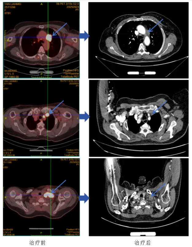 2025年9月,闫女士因“左手肿胀麻木2天”在当地医院就诊,胸部CT检查发现左侧中上纵隔占位性病变,伴左侧腋窝、锁骨上及纵隔内多发肿大淋巴结。随即行超声引导下左锁骨上淋巴结穿刺,查见恶性肿瘤。为寻求精准救治,闫女士来到山东第一医科大学附属肿瘤医院,求助于王海永教授团队。PET/CT检查结果显示:左前纵隔、左侧锁骨区、左侧颈根部多发肿块及结节,均考虑为相同性质恶性肿瘤。病理会诊结果明确诊断为转移性分化差的癌,倾向SMARCA4缺失的低分化腺癌。由于基因检测未发现突变,患者并无靶向治疗机会。病情已发展至晚期,高龄加上晚期病情,让患者的诊疗之路充满考验。我院第一时间为闫女士组织多学科会诊(MDT),综合评估患者的年龄、身体状况、病情分期等关键信息后,给出专业诊疗意见:建议患者优先入组针对SMARCA4缺失型肺癌的临床试验。随后,闫女士顺利入组王海永主任发起的“艾帕洛利托沃瑞利单抗联合含铂化疗和盐酸安罗替尼治疗SMARCA4缺失的晚期或转移性非小细胞肺癌的单臂、II期探索性研究”。完成2周期治疗后,患者于2025年12月24日行胸部CT复查,结果显示左前纵隔肿瘤及左侧锁骨区、左侧颈根部转移淋巴结较前明显缩小,治疗效果显著。王海永主任及其团队考虑患者高龄,为避免严重不良反应的发生,予以积极对症处理,延长住院时间,患者耐受性良好。截至目前,闫女士已完成8个周期的规范治疗,顺利进入维持治疗阶段,病情持续稳定,且在整个治疗过程中患者耐受性良好,未出现明显不良反应,生活质量得到有效保障。